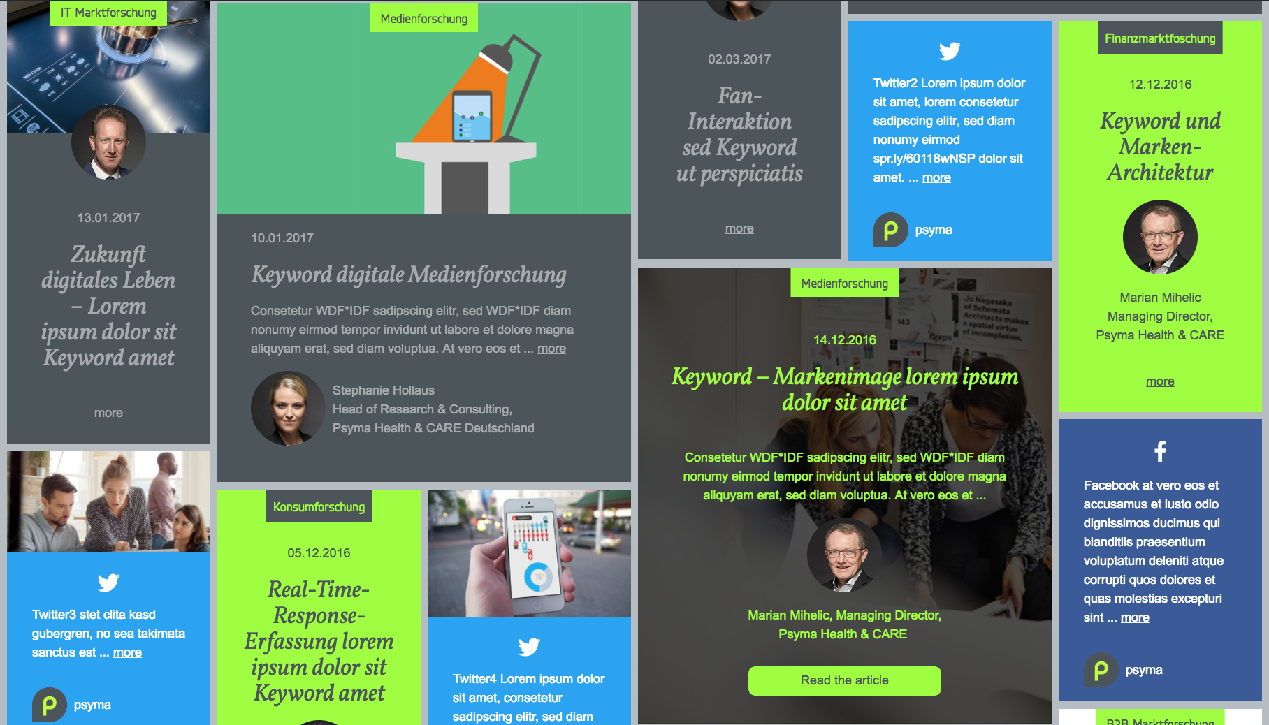Jeder dieser Beitragstypen hat ein anderes Erscheinungsbild in der Blogübersicht. Dabei sollten die Beitragstypen so ausgewählt werden, dass sie eine möglichst abwechslungsreiche und zusammenpassende Blogübersicht ergeben. Die Reihenfolge der Beiträge im Frontend wie im Backend ist chronologisch, wobei der neuste an erster Stelle steht.