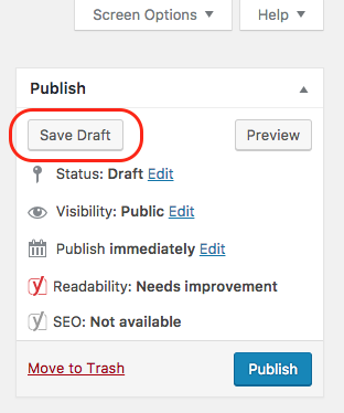 Ein Beitrag wird bevor er alle Inhalte hat nur als Entwurf gespeichert, da er so noch nicht für Besucher der Webseite sichtbar ist. So kann der Beitrag zu einem späteren Zeitpunkt weiter bearbeitet werde. Das benötigte Feld befindet sich rechts oben, im Folgenden rot markiert.