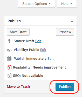 Vor dem Veröffentlichen sollte sollten unbedingt alle eingepflegten Inhalte noch einmal auf ihre Richtigkeit geprüft werden, dazu kann die Vorschau (Preview) genutzt werden. Vor allem der Permalink muss korrekt sein, da nach dem Veröffentlichen die Seite für Besucher der Webseite sowie für den Googlebot sichtbar ist. Das benötigte Feld zum Veröffentlichen befindet sich rechts oben, im Folgenden rot markiert. Unter dem Punkt „Publish immediately“ (Sofort veröffentlichen) kann der Beitrag durch eintragen von Datum und Uhrzeit auch zeitgesteuert veröffentlicht bzw. der Veröffentlichungszeitpunkt im Nachhinein angepasst werden. Falls der Beitrag vor der Veröffentlichung noch einmal von jemand anderem geprüft werden soll, bietet es sich an ihn auf „Pending Review“ (Ausstehender Review) zu setzen, dadurch wird im Vergleich zum Entwurf ersichtlich, dass der Beitrag bereits komplett eingepflegt wurde.