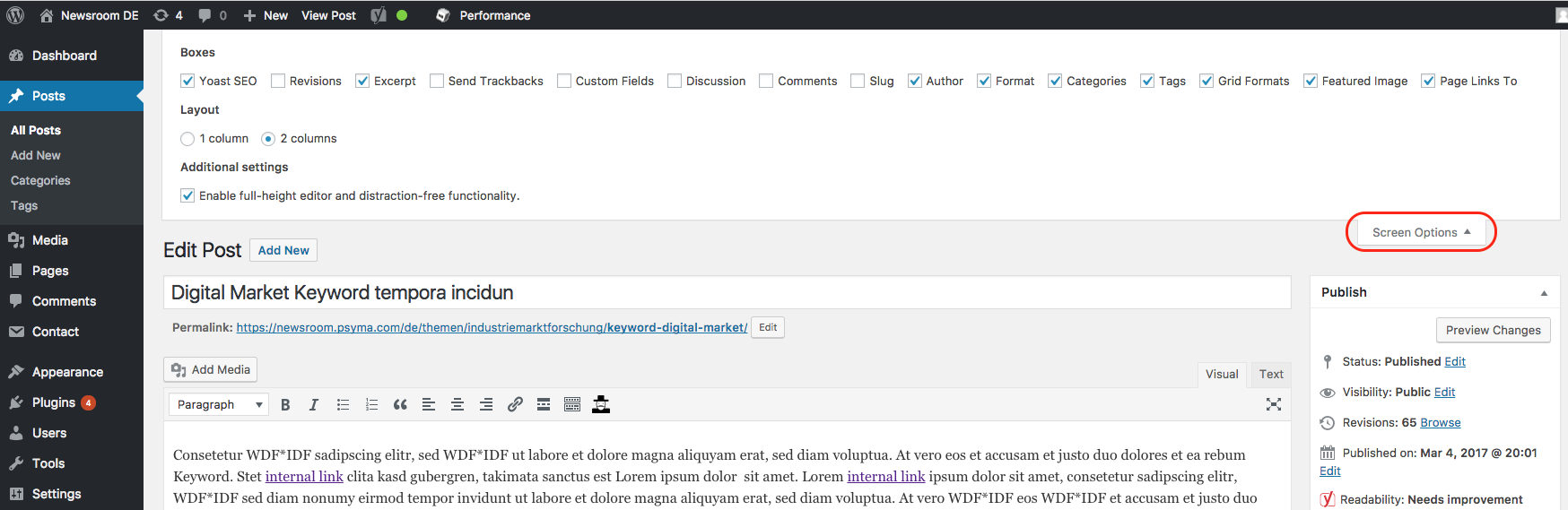 Hauptüberschrift und Permalink (URL) bauen aufeinander auf. Sie sollten beide das entsprechende Keyword enthalten, um für eine bessere Auffindbarkeit des Beitrags im Internet zu sorgen. Der Permalink (URL) ergibt sich automatisch aus der Hauptüberschrift nach dem Speichern (siehe 1.4.). Der Permalink (URL) sollte immer auf seine Richtigkeit geprüft und gegebenenfalls angepasst werden. Der Permalink (URL) besteht im Idealfall aus dem Keyword in Kombination mit anderen themenrelevanten Begriffen. Dabei sollte das Keyword immer möglichst am Anfang stehen. Füllwörter sollten weggelassen werden, da die URL möglichst kurz sein soll.
