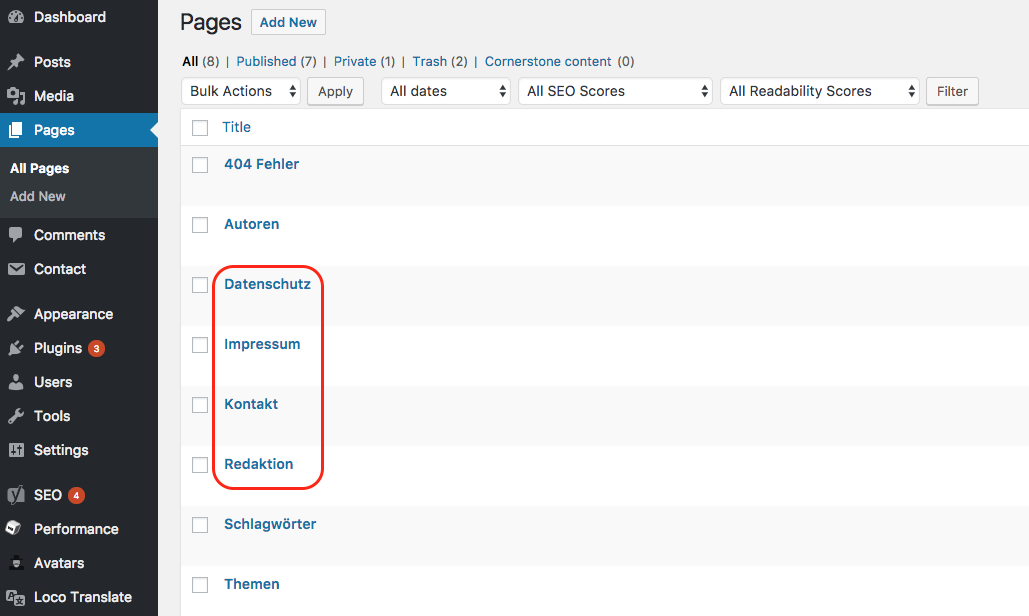 Unter dem Menüpunkt Pages (Seiten) können Änderungen an vorhandenen Basis-Seiten vorgenommen werden. Die für Sie relevanten Seiten sind im Folgenden rot markiert: